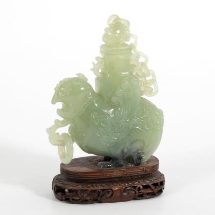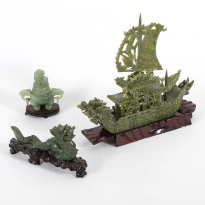 Schiff, Drache und Vase aus grünem Nephrit.