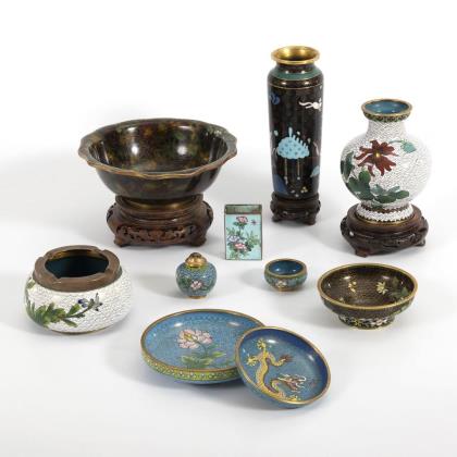 Konvolut von 10 Cloisonné-Schalen und Vasen.