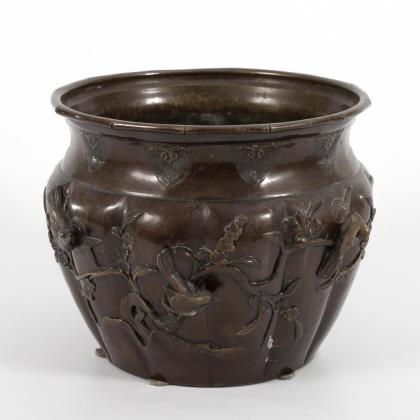 Großer Bronze-Übertopf mit plastischen Vögeln.