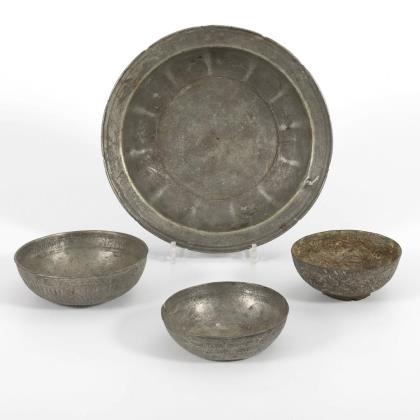 Große Schale mit arabischen Schriftzeichen im Rand und einer Lötstelle. Ø 29,5 cm. / Getriebene Schale mit umlaufender arabischer oder hebräischer Schrift im Innenrand. Ø 16 cm. / Kleine Schale mit flachem Boden und ziseliertem Muster innen und außen. Ø 14,5 cm. / Sehr schöne getriebene Schale mit ganzflächigem Blumenornament, Ø 13,5 cm