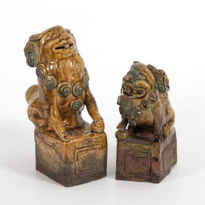 Auf verziertem Sockel stehende Fo-Hunde mit je einem Ball unter der Pfote und im Maul. Der größere mit geöffnetem Maul. Die Sockel sind nur zum Teil glasiert