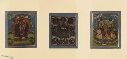 Tanzende Kali und Mahakala auf einem Reittier, in ähnlichem Stil gehalten, von Wolken und Päonienblüten umgeben. 28 x 22 cm./ Gelber Buddha, von weiteren Heiligen umgeben. 21 x 18 cm. Alle in Passepartout und Folie