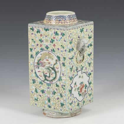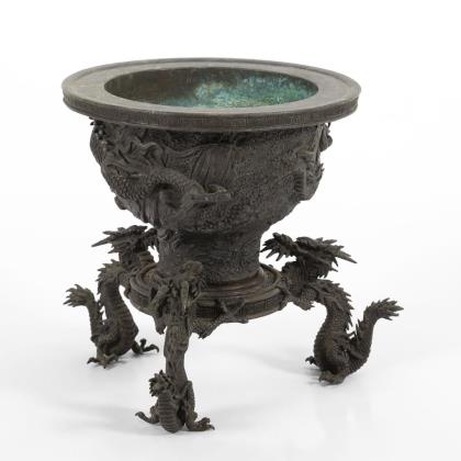 Gefäßwandung mit sehr fein ausgearbeitetem Drachenrelief mit Kugel in den Fängen. Ebensolche Qualität bei den drei Drachen, die als Füße für den Ständer dienen. Sockel und oberer Rand mit schmaler Leiwen-Zierkante