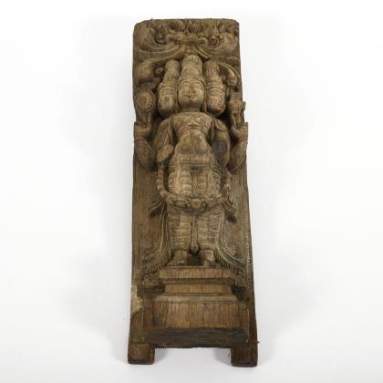 Holzrelief mit dreiköpfiger Gottheit.