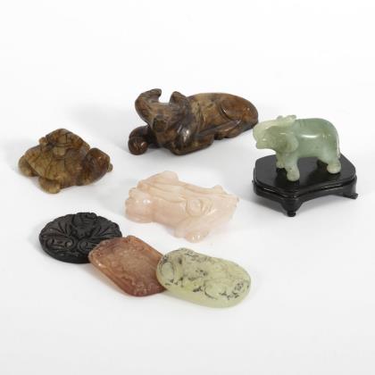 Schildkröte und Steinbock aus braun geäderter Jade. Elefant aus grüner Jade. Frosch aus Rosenquarz. Drei Medaillonreliefs in feiner Schnitzerei mit Fledermaus; Gelehrtenfigur und Steinbock ebenfalls aus Jade