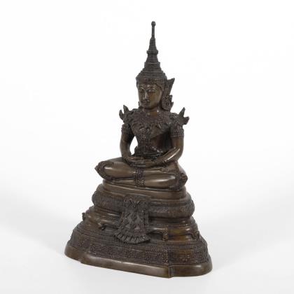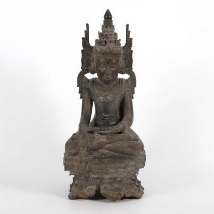 Auf hohem Sockel sitzende Figur im Verschränkungssitz, mit der Geste der Meditaion und der Erdberührung. An den Kniescheiben eine Art Flechtsymbol. Mehrteilige Krone mit seitlichen Erweiterungen. Aus einem Stück geschnitzt und mit Resten alter Vergoldung