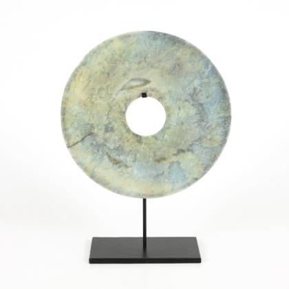 Aus hellgrünem Nephrit; polierte Scheibe. Vorder- und Hinterseite in unterschiedlichen Farbtönen. Mit Ständer