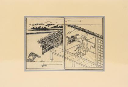 Die schwarz/weißen Holzschnitte bestehen immer aus zwei Teilen und sind wohl hauptsächlich aus einem Buch getrennt, da unter dem Passepartout weitere Textseiten vorhanden sind. Davon zwei Blätter ohne Textergänzung, eines mit Bleistift bezeichnet: "Minamoto no Takatame, 1802". / Zwei weitere Blätter mit Stadtlandschaften, ebenfalls zweigeteilt. Alle im Passepartout, die meisten noch in Folie