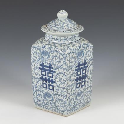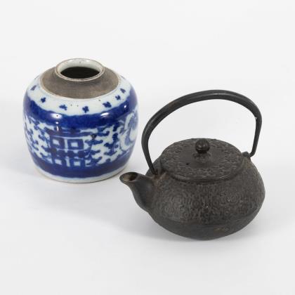 Kleine Eisenkanne, gemarkt, mit flachem Blütenrelief auf oberer Wandung. H 12 cm. / Kleine Dose mit Schriftzeichen "Doppelte Freude" zwischen Rankenornamenten. Ohne Deckel, H 9 cm