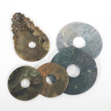 Rötliche Bi-Scheibe mit Schlitz und einfachem Ornament. / Zwei fein reliefierte Scheiben mit filigranen Durchbruchsarbeiten. / Schwarze Swastika mit reliefierten Ruij-Zeptern, die sich kreuzen