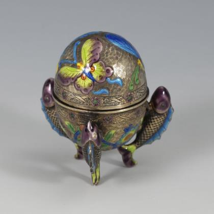 Eiförmige Dose mit drei Fischen als Beine und farbkräftigen Blüten und Schmetterlingen auf ziseliertem Grund