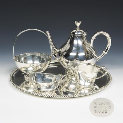 Ränder mit Korbrelief: Tablett, Teekanne, Zuckerschale, Milchkännchen. Konfektschale mit feststehendem Tragegriff und Perlleisten-Relief
