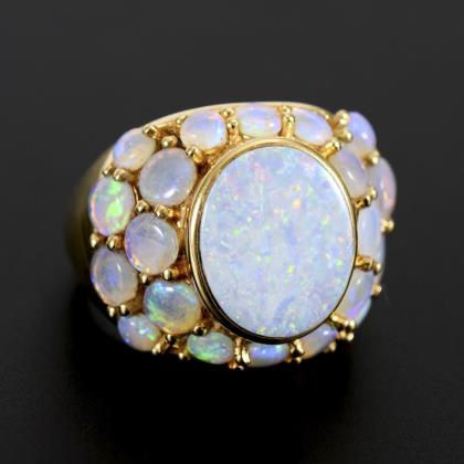 Zargengefasste Dublette, umgeben von 20 Opalcabochons, auf breiter Verlaufschiene