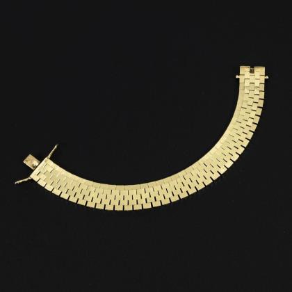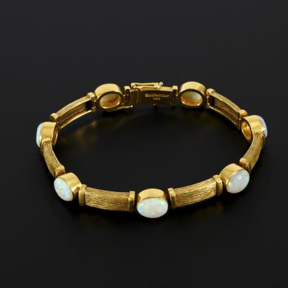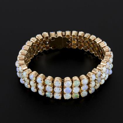Gliederband mit 99 Opalcabochons auf hohen Zargen, im leichten Verlauf, krappengefasst. Kastenschloss