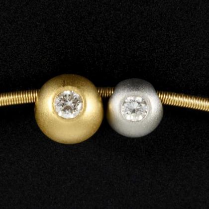 Spiralkette mit 2 Kugelanhängern mit kleinen, eingelassenen Brillanten. 2 Patentverschlüsse