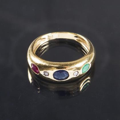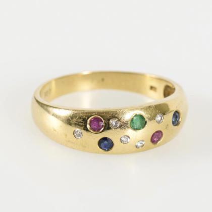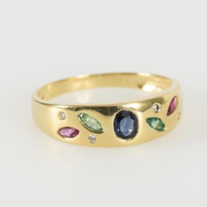 Mittlere Verlaufschiene mit 5 kleinen, eingelassenen Brillanten, 2 Saphiren, 2 Rubinen und 1 Smaragd