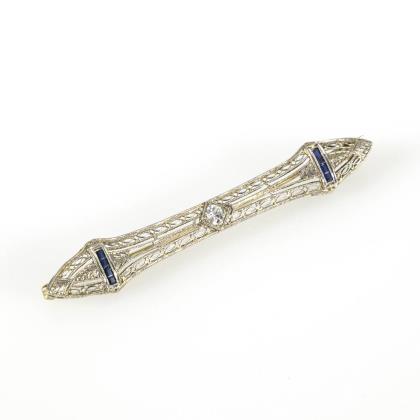Brosche mit Brillant und seitlich eingelassenen, kleinen Saphirstegen. Kugelhaken
