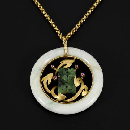 In Jadering montierte Goldzier, kleine Jadetafel und 4 kleine, chatongefasste Rubine, an Erbskette mit Ringfederschließe