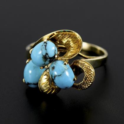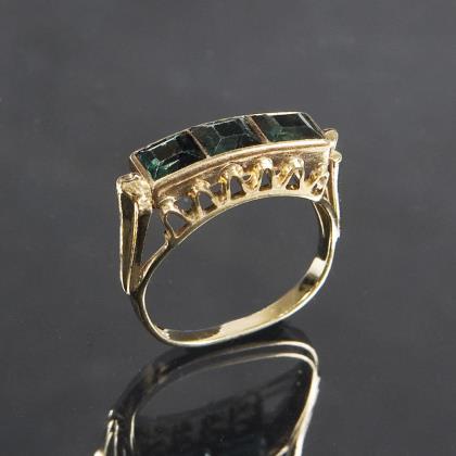 3 krappengefasste Cabochons in plastisch gestaltetem Ringkopf, zwischen schmaler Schiene