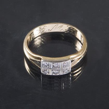 Eingelassener Altschliff-Brillant und 4 kleine Diamanten, zwischen schmaler Schiene