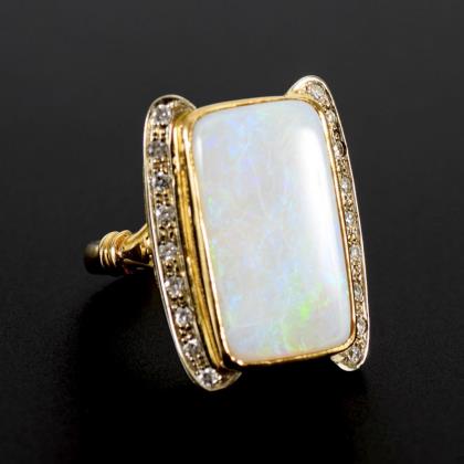 Zargengefasster Opal und 18 kleine, eingelassene Brillanten, zwischen mittlere Schiene