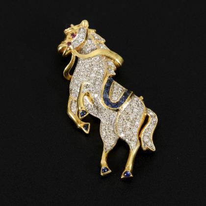 Plastisch gearbeitete Brosche mit pavégefassten, kleinen Brillanten, 14 Saphiren und 2 Rubinen. Kugelhaken