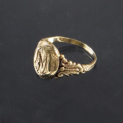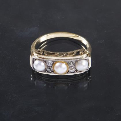 Millegriffesringkopf besetzt mit 3 Altschliff-Diamanten und 6 kleinen Diamanten im Rosenschliff, zwischen schmaler Schiene
