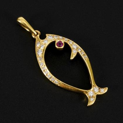Fischanhänger mit Brillant, Diamanten und Rubin.