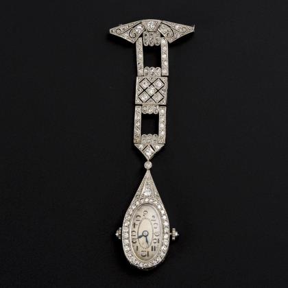 Art-déco-Broschenuhr mit Diamanten und Diamantrosen, um 1910.