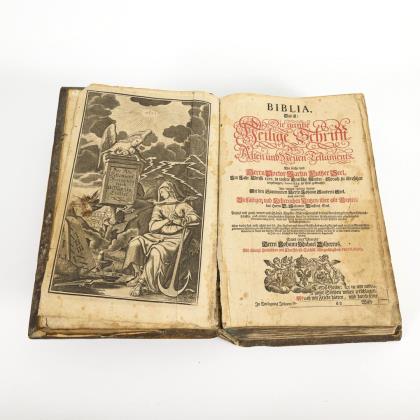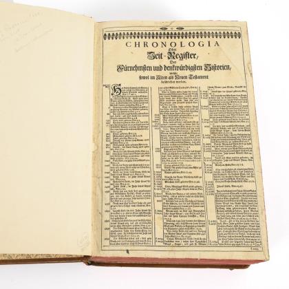 Teilband, enthält "Die fünf Bücher Moses, und die geschichtlichen Schriften des Alten Testaments". Nach der in Zürich kirchlich eingeführten Uebersetzung, auf`s neue mit Sorgfalt durchgesehen. Gedruckt auf Kosten der Zürcherschen Bibel-Gesellschaft". 815 Seiten im Halbledereinband, mit handschriftlicher Widmung
