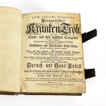 (6), 688, (8) Seiten. Beigebunden: "Tägliches Gebet-Büchlein, Das ist: Aufmunterung ... für Schwangere, Gebährende und Sechswöchnerinnen ... Unfruchtbare ... ", 133, (2) Seiten. Im Ledereinband mit fehlenden Schließen
