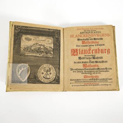Titelkupfer mit Ansicht von Blankenburg, Titel, (4), 100 Seiten und 5 Tafeln, im Pergamenteinband