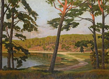 In der Art von Leistikow gemaltes Seeufer mit angrenzendem Kiefernwald im warmen Sonnenlicht
