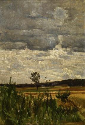 Undeutlich signiert: Felderlandschaft unter dunklen Wolken.