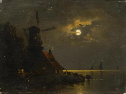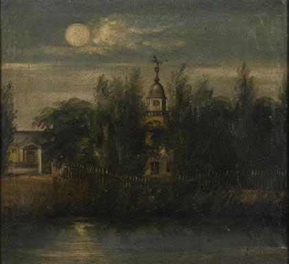 Kleine Landschaft mit Schloss unterm Vollmond.