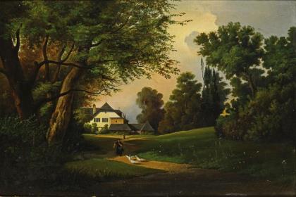 Staffagefiguren auf dem Weg nahe dem Haus zwischen dicht stehenden Bäumen