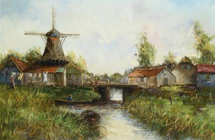 Ansicht eines Dorfes mit Windmühle, Kahnfahrer und Bäuerin beim Wäsche aufhängen
