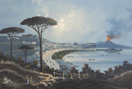 Weite detailreich gemalte Ansicht mit Vesuv-Ausbruch. Passepartout, verglaster Waschgoldrahmen