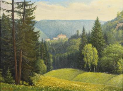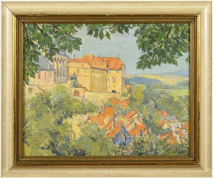 Heller Sonnenschein über den blühenden Wiesen und dem dichten Wald rund um das Thüringer Schloss. Dazu verso anhängend die originale Verkaufskarte des Malers
