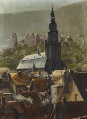 Blick über die Dächer des Ortes mit Heiliggeistkirche vor dem Schloss auf dem Berg