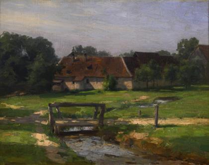 Bachlauf mit kleiner Brücke vor großem Gehöft im Sonnenschein