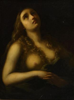 Die junge Frau mit langem, lockig-rotem Haar und herabgelassenem Gewand, den Blick gen Himmel gerichtet und die Hände gefaltet