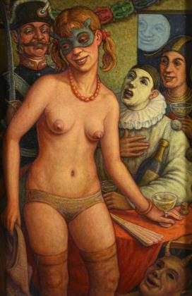 Halbnackte, lachende junge Frau vor Soldat und Harlekin
