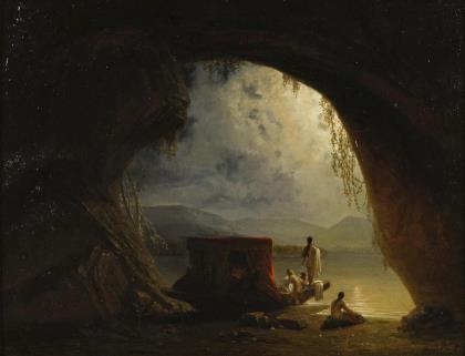 Mehrere junge Frauen in einem Boot mit Zelt beim Baden nahe einer Höhle im hellen Licht des Vollmondes