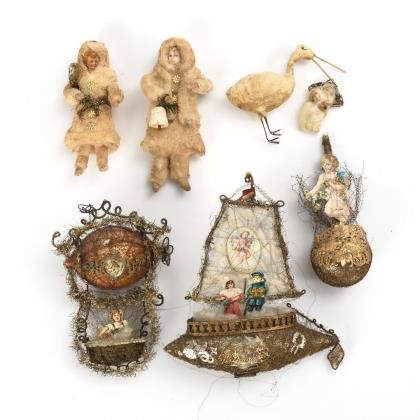 3x mit leonischen Drähten: Schiff mit Wattesegel (H 20 cm), Heißluftballon (H 15 cm) und Glaskugel (L15 cm). / 4 Wattefiguren: 2 Mädchen mit Oblatengesichtern, Storch und Baby (H 5,5 - 14,5 cm)