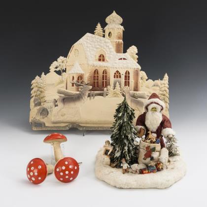 Pappkirche mit Schneeglimmer auf dem Dach, 43 x 48,5 cm. / Weihnachtsmann mit Baum, Geschenkesack und Tieren, auf Wattesockel. 23 x 27 x 24 cm./ 3 Fliegenpilze aus Watte und Masse. H je 11 cm