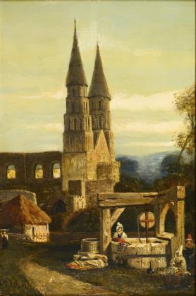 Wohl frühes Werk des Künstlers mit Staffagefiguren an einem Brunnen nahe einer Kirche unter wolkigem Himmel
