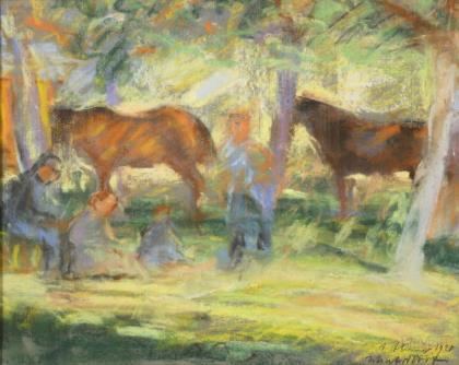 AHNER, Alfred (1890 Wintersdorf - 1973 Weimar). Bauern bei der Rast mit Pferden.