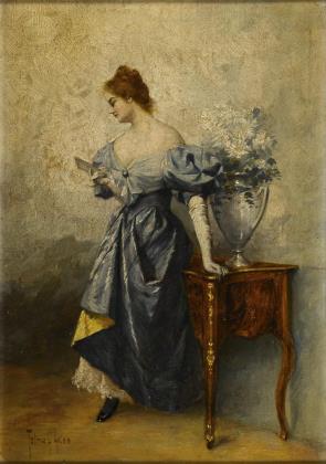 Junge Frau in festlichem Kleid mit einem Brief an einer Kommode