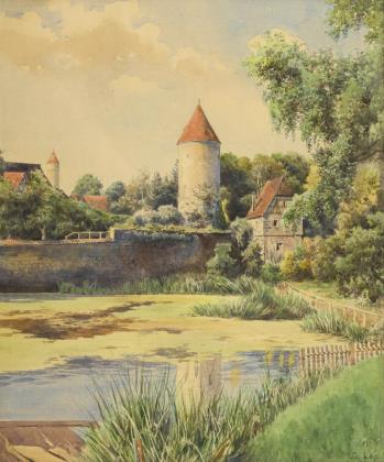 WOLTZE, Peter (1860 Halberstadt - 1925 Weimar). Stadtmauer mit Teich im Sonnenschein.